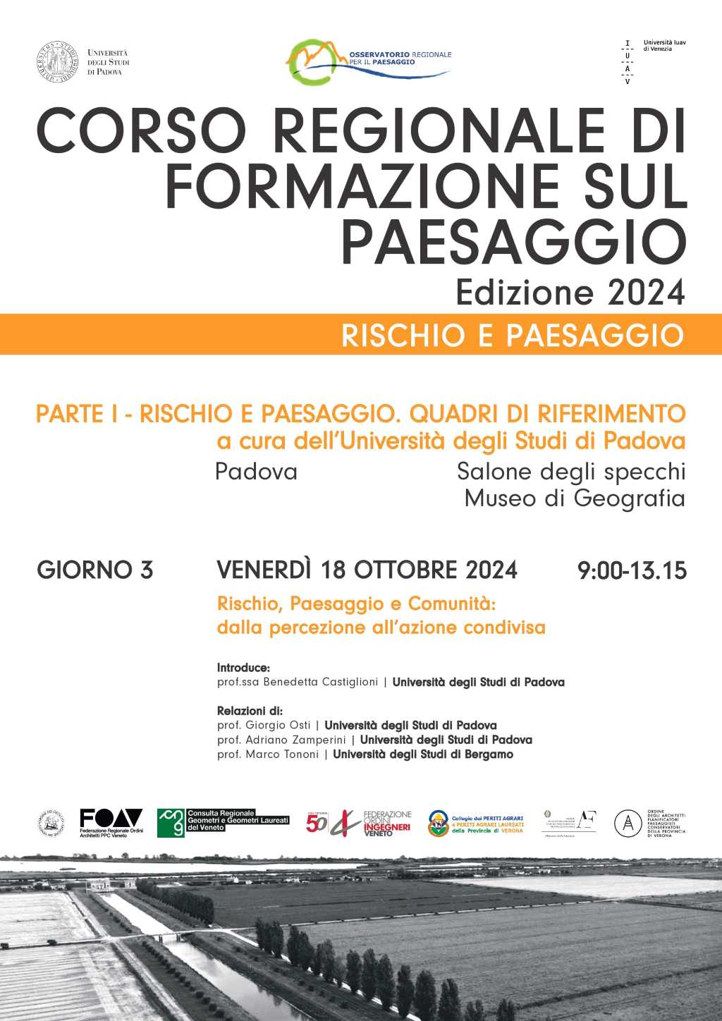 La terza giornata del Corso regionale di formazione sul paesaggio veneto – Edizione 2024, organizzato dall’Osservatorio regionale per il paesaggio in collaborazione con l’Università degli studi di Padova e l’Università IUAV di Venezia si occuperà del rapporto tra Rischio, paesaggio e comunità: dalla percezione all’azione condivisa. Interverranno, dopo l’introduzione della prof.ssa Benedetta Castiglioni, il prof. Giorgio Osti e il prof. Adriano Zamperini dell’Università degli Studi di Padova e il prof. Marco Tononi dell’Università degli Studi di Bergamo.