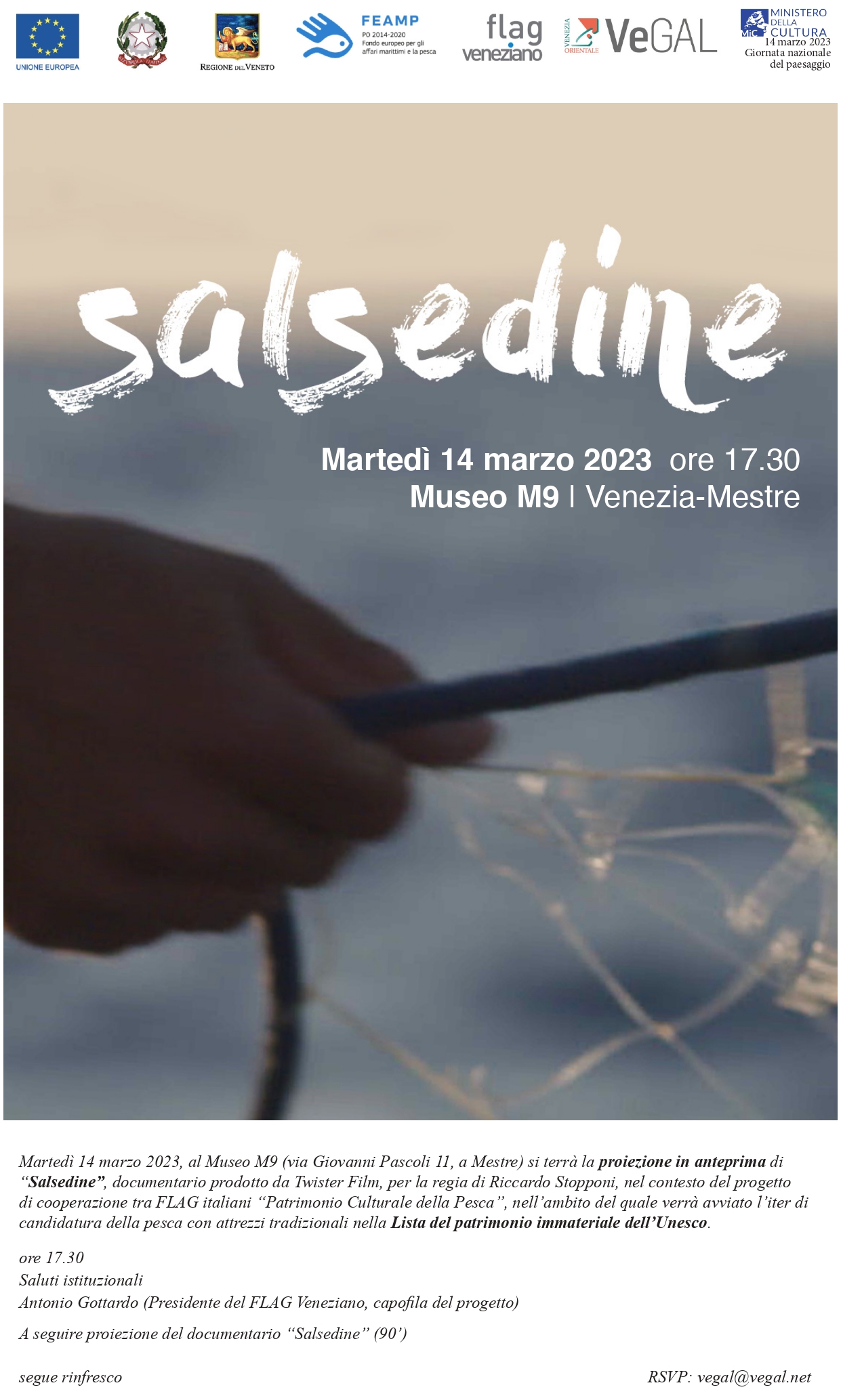 Presentazione del documentario Salsedine che si terrà martedì 14 marzo alle ore 17.30 al museo M9 di Mestre, in concomitanza della giornata nazionale del paesaggio 2023.