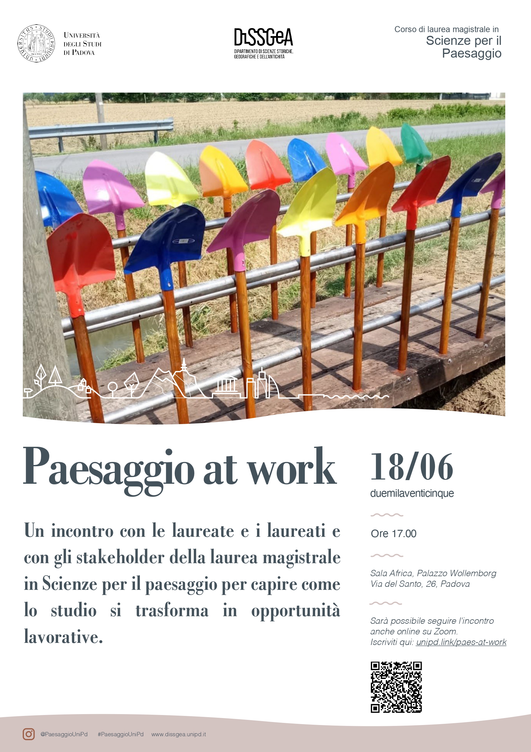 Il Corso di laurea magistrale in Scienze per il Paesaggio organizza un incontro per il 18 giugno 2025 sempre presso Palazzo Wollemborg a Padova con le laureate e i laureati e con gli stakeholder della laurea magistrale in Scienze per il paesaggio per capire come lo studio si trasforma in opportunità lavorative.