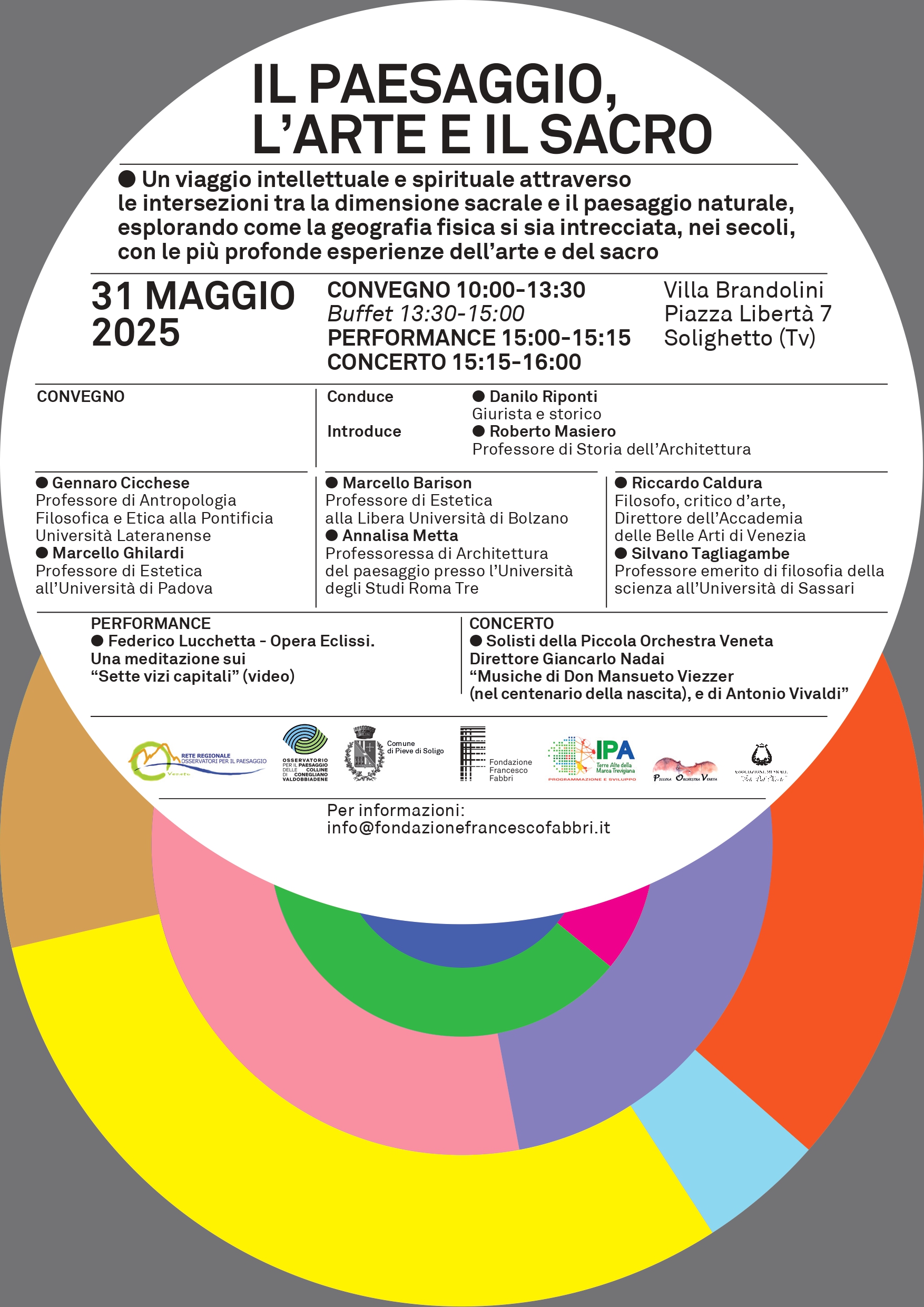 La Fondazione Francesco Fabbri, con il patrocinio del Comune di Pieve di Soligo, organizza, per il giorno sabato 31 maggio 2025, presso Villa Brandolini a Solighetto (TV), il convegno dal titolo “Il Paesaggio, l’Arte e il Sacro”.