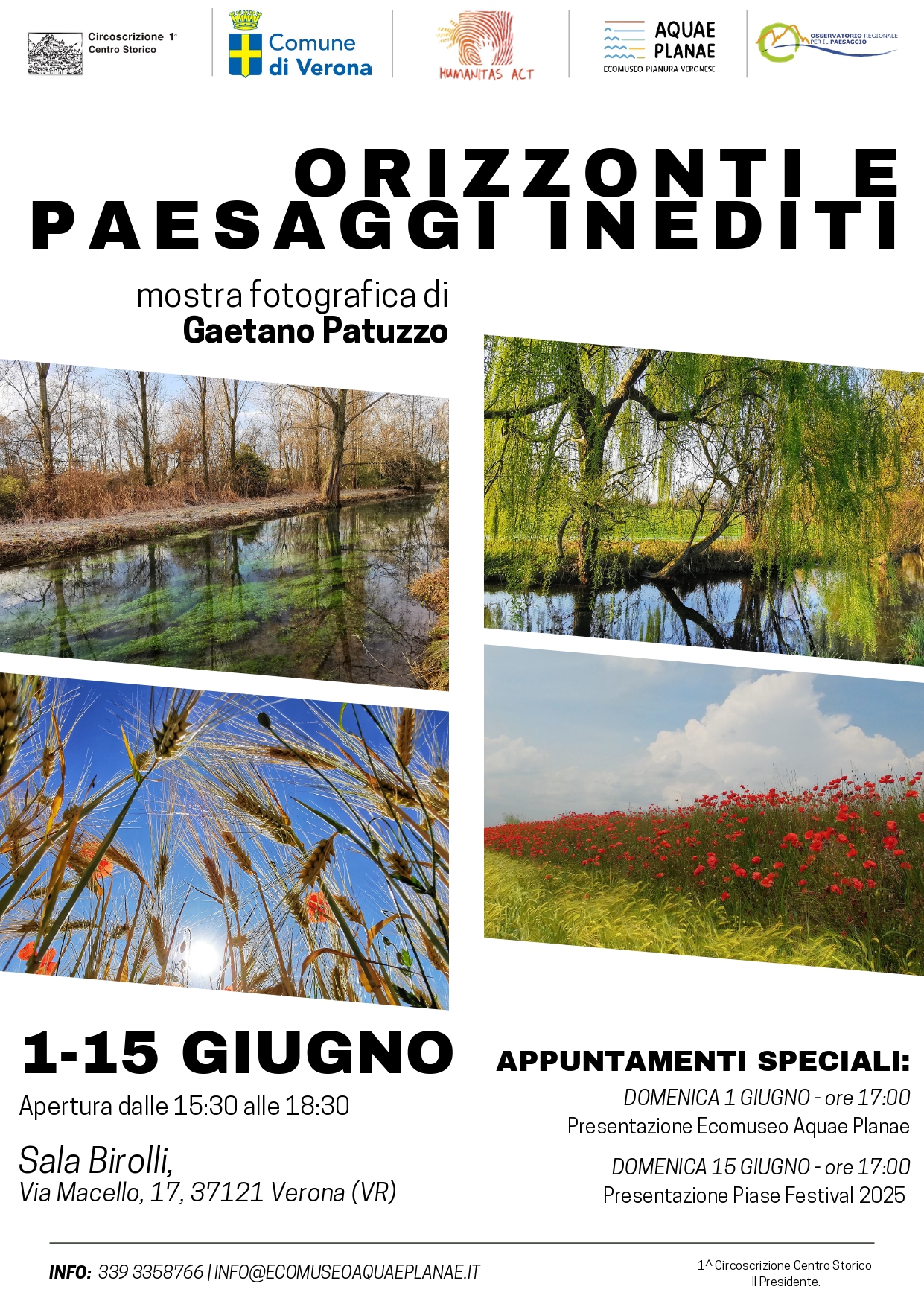 L’Osservatorio locale per il paesaggio della Pianura Veronese, in collaborazione con il Comune di Verona, allestisce per il periodo che va dal 1 al 15 giugno, la mostra fotografica “Orizzonti e Paesaggi Inediti” di Gaetano Patuzzo. Si tratta di un racconto per immagini capace di restituire nuove prospettive e sguardi inediti sulla Pianura Veronese.